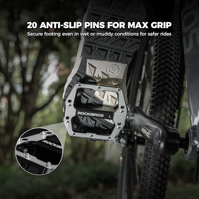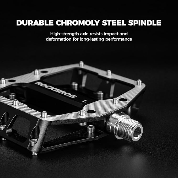 Pedale pentru bicicletă ROCKBROS, pedale plate din aluminiu, platformă antiderapantă de 11 × 10 cm cu pini antialunecare, prelucrate CNC, ax de 9/16 inch, pentru MTB, biciclete gravel, trekking și downhill.