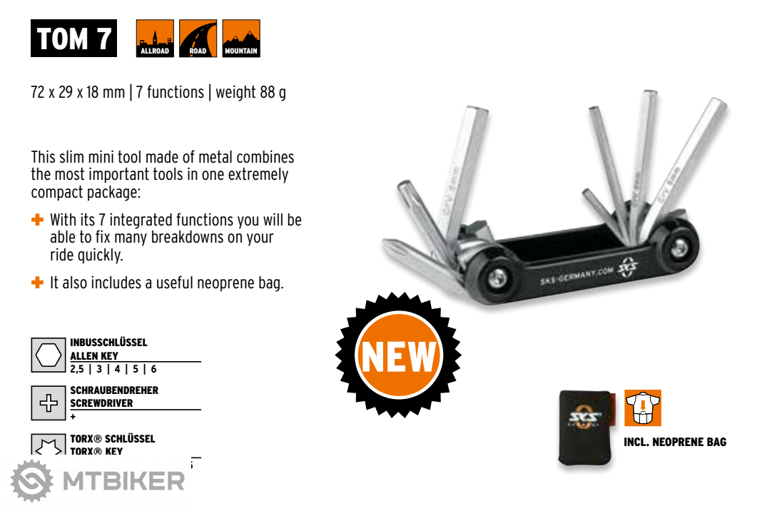 Setul de scule usoare si compacte (cheie multipla) contine cele mai importante 7 unelte pentru reparatii pe drumurile tale. Pe lângă bitul Allen (2,5 / 3/4/5/6/8 mm), sunt incluse o șurubelniță Phillips și Torx T25. Este inclusă o husă practică din neopren.
